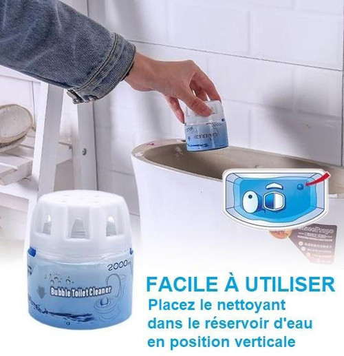 Produit des bulles bleues étincelantes provenant du réservoir d'eau. Elles nettoient le réservoir lui-même, le rebord, l'intérieur de la cuvette, le tuyau d’égout et d’autres parties de la toilette.