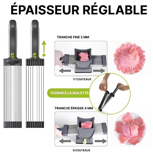 Cette trancheuse est conçue pour couper la viande avec précision et rapidité. Que vous prépariez de fines tranches de b'uf pour un sauté savoureux ou de morceaux plus épais pour un steak copieux, cet ustensile répond à vos besoins.